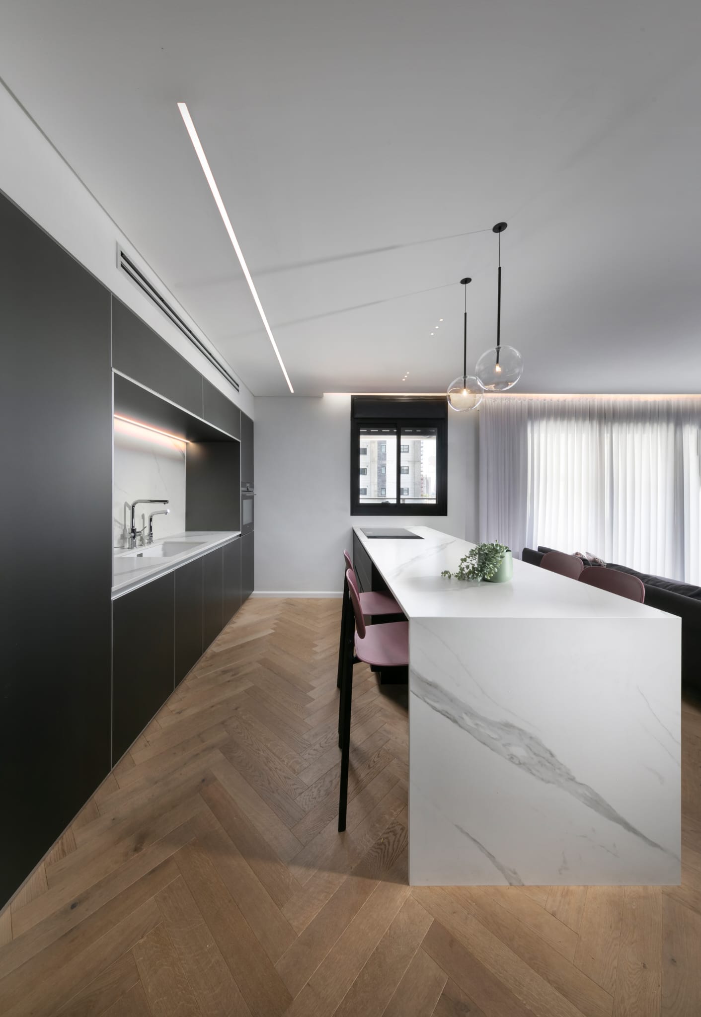 דירה ברמת גן שנבנתה סביב אורח חיים מודרני, קצבי ונעים. הדיירים – זוג צעיר עם ילד אחד – ביקשו מרחב שמרגיש יוקרתי אך לא מרוחק, כזה שאפשר להזמין אליו חברים, להכין יחד ארוחת ערב, ולהירגע בו בסוף יום אינטנסיבי.